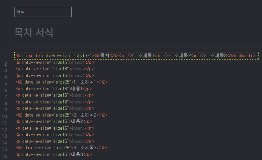 저와 동일한 목차 틀을 사용하시려면 바로 👉전체 코드를 HTML 모드에 붙여넣어서 저장하셔도 됩니다 :-)
