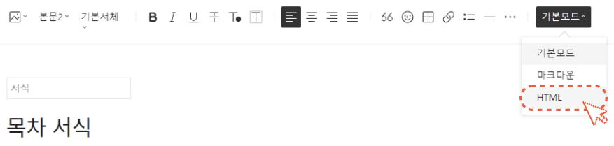 글쓰기 도구 오른쪽 위 '기본모드'를 'HTML'으로 바꿔주세요.