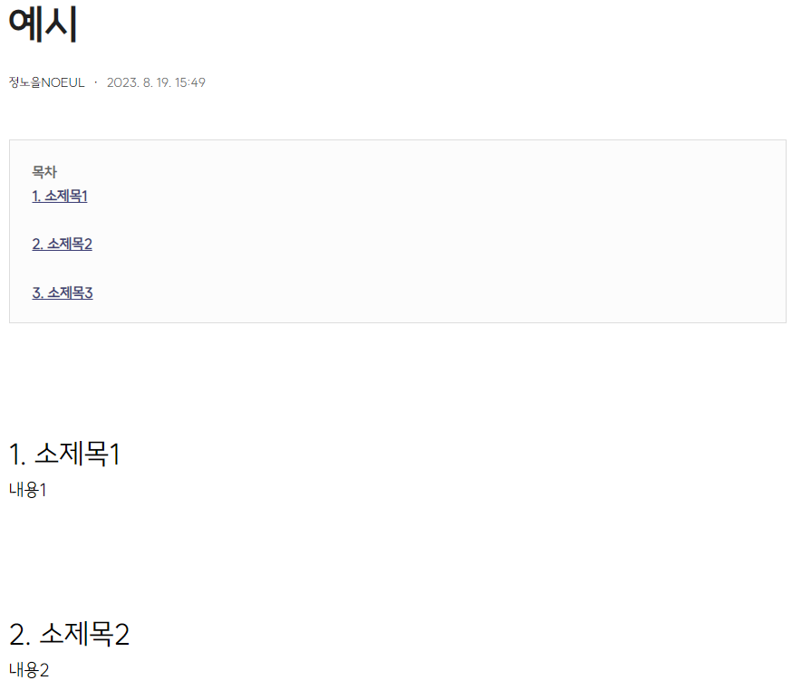 실제로 글 등록을 하시면 목차를 클릭했을 때 해당 부분으로 이동되는 것을 확인하실 수 있어요